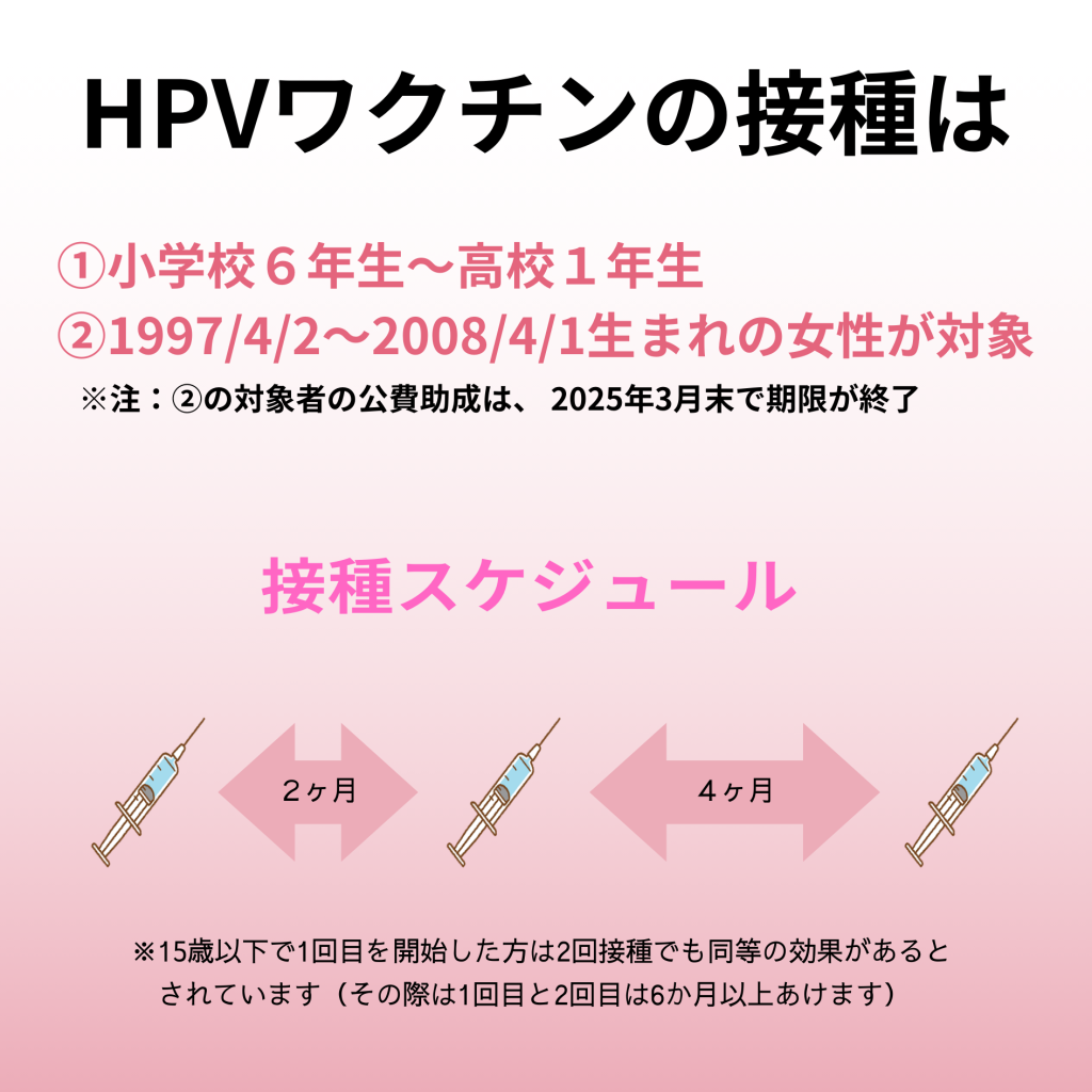 HPV感染症を防ぐワクチン(HPVワクチン)は、小学校6年~高校1年相当の女子を対象に、定期接種が行われています。